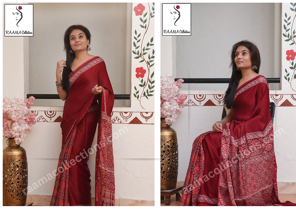 Our specialisation is handprinted Ajrakh sarees. Ajrakh is a unique fabric from 'Kutch, Gujarat'. These ethnic pieces are appropriate for parties, weddings, and other special occasions. These sarees include unique designs and patterns created by stamp block printing. The light weight and ease of draping are attractive and essential advantages benifits.